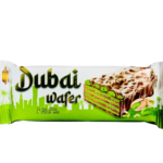 potente galleta wafer de 3 capas crujientes con sabor a pistacho y adicional trocitos de pistacho incrustados en la primera capa de un baño de chocolate con leche muy ligero MMMM……. esta para chuparse los dedos ! PRUÉBALO !!! NO TE LO PIERDAS !!!!!